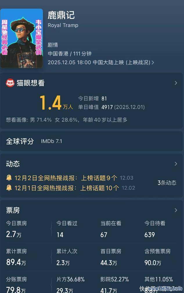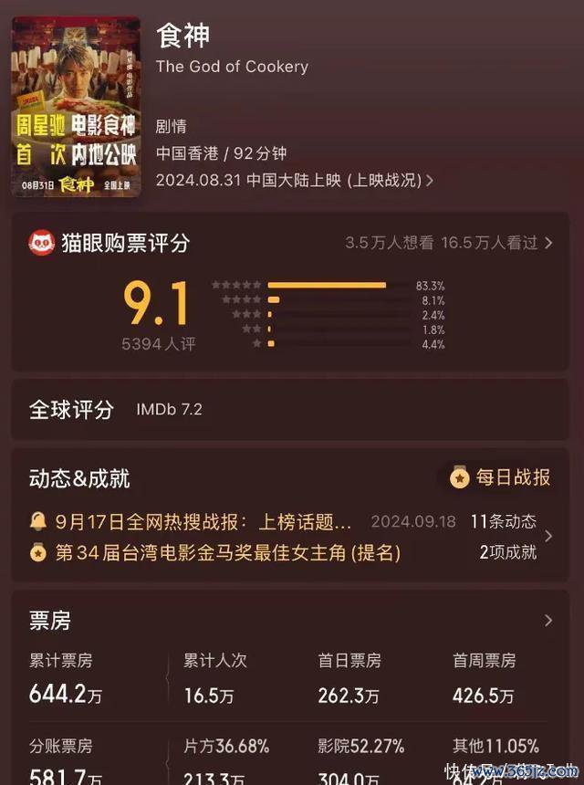 上周五上映了10部以上的电影,有剧情片有笑剧,关联词最终齐宣告扑街了,郭富城,吴镇宇等四位影帝出演的《内幕》也才一千多万的票房。 要说独一有点热度的,可能即是正午的新电影《得闲谨制》了,电影的瞻望收货也达到了3亿多,诚然和《动物城》比拟,还不足东说念主家的零头,但不管怎样,算是这一段技艺,唯二的破亿电影了。 比拟较而言,周星驰的电影《鹿鼎记》就莫得那么幸运了,电影是33年前的一部经典作品,如今上映大银幕还作念了缔造,底本念念着不少心爱周星驰的粉丝们不错走进电影院。 但电影上映了快一周的 技艺了,票房唯有69万,片方的分账还不到30万,这倒是很让东说念主偶然啊。